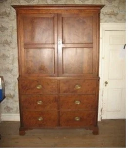 Mr. Powers, an authority on 18th and 19th-century cabinetmakers in Frederick County, VA, believes that the walnut linen press was possibly made in a local shop in the period 1790-1800, based on its details. It is known to have been in Gov. Holliday's home in Winchester.